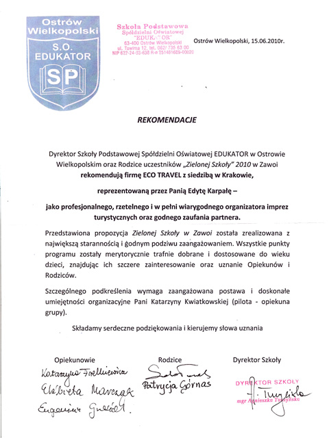 "Dyrektor Szkoły Podstawowej Spółdzielni Oświatowej EDUKATORw Ostrowie Wielkopolskim oraz Rodzice uczestników "Zielonej Szkoły" 2010 w Zawoi rekomendują firmę ECOTRAVEL z siedzibą w Krakowie, reprezentowaną przez Panią Edytę Karpałę - jako profesjonalnego, rzetelnego i w pełni wiarygodnego organizatora imprez turystycznych oraz godnego zaufania partnera."