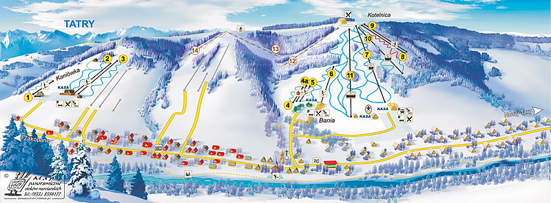 wyciąg krzesełkowy (4 os.) – długość 1250 m, przepustowość 2200 os./godz., nachylenie ok. 200 m, wyposażony w chodnik rozbiegowy, nowy wyciąg krzesełkowy o dł 750 m, obok trzy wyciągi orczykowe: o dług. 100, 210 i 500 m, snowpark. Jeden karnet na wszystko, w sumie 3 km tras: