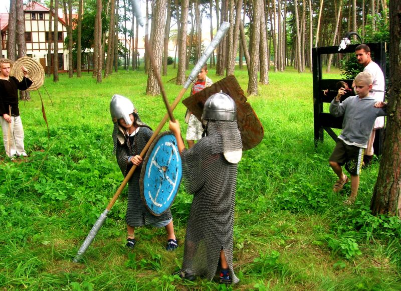 SZKOLENIE PIRATA „OD MAJTKA DO KAPITANA”: zasady orientacji w terenie, posługiwanie się mapą i kompasem, zasady komunikacji na morzu, alfabet Morse’a, odnajdywanie gwiazdy polarnej, nauka władania mieczem pirackim, który sami zrobimy lub zdobędziemy. Gra nocna – poszukiwanie „Skrzyni Umarlaka”. Tor piracki – czy awansujesz z majtka na Kapitana? Uroczyste pasowanie na pirata i kapitana piratów – chrzest morski, gra terenowa „zdobywanie flagi” oraz „obrona skarbu pirackiego”.
