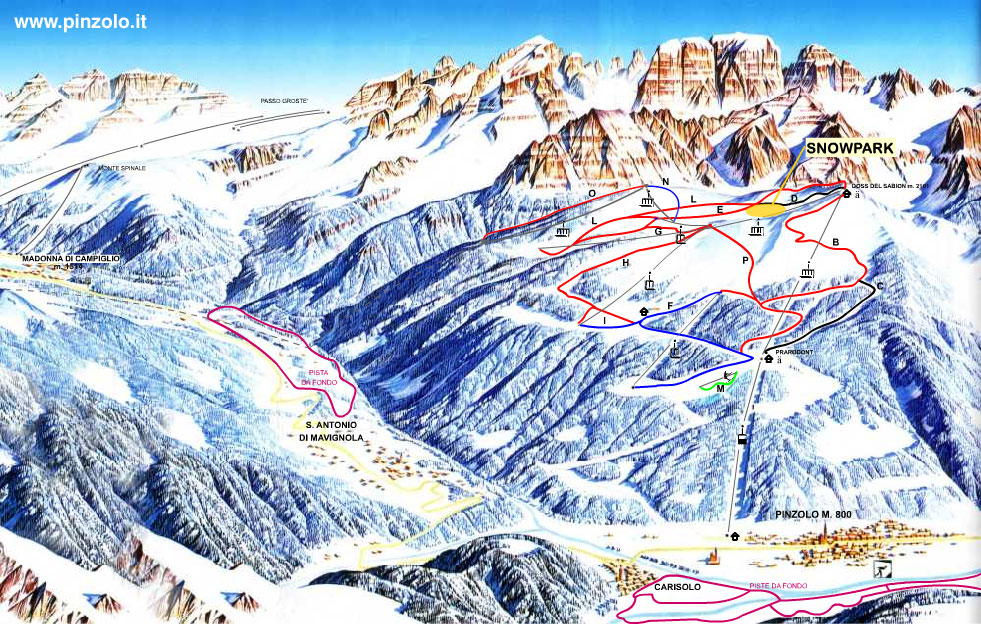Pinzolo - w sezonie 2010/2011 zostało połączone nową gondolą z Madonną di Campiglio, ta dynamicznie rozwijająca się stacja zadowoli nie tylko początkujących i średnio zaawansowanych narciarzy ale także miłośników wypraw narciarskich wśród pięknych widoków oraz rodziny z dziećmi, dla których przygotowano park zabaw Pratomatto (koło kolejki Pra Rodont), snowboardziści również znajdą tu coś dla siebie - działa tu snowpark "Brentapark". Łącznie w Pinzolo jest ponad 35 km tras - to doskonałe miejsce aby odpocząć od gwaru Madonny i zakosztować narciarstwa wśród dzikiej przyrody.