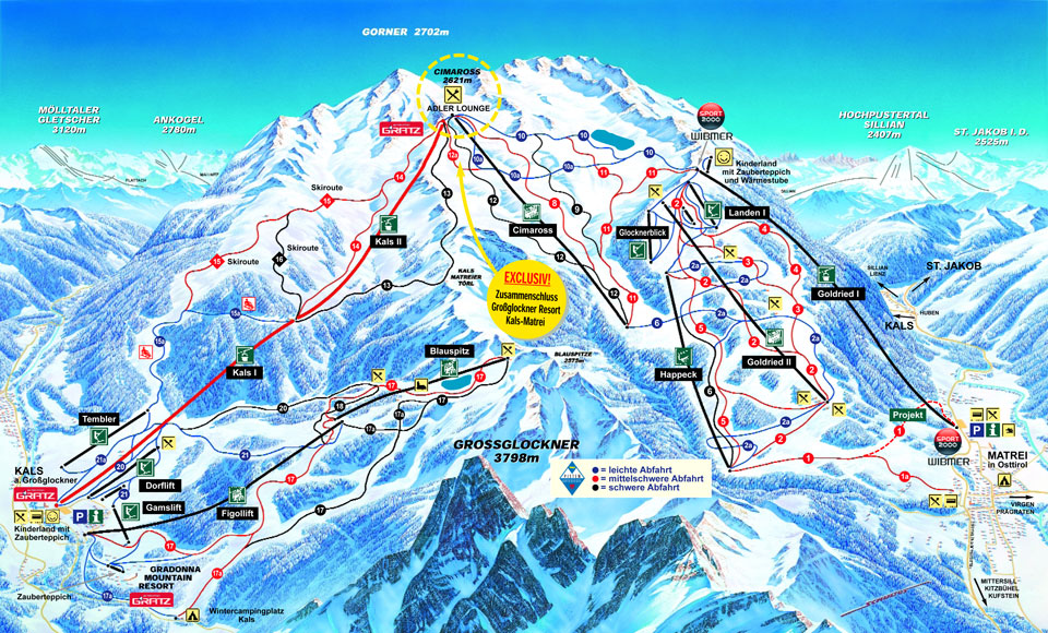 GROSSGLOCKNER RESORT KALS-MATREI położony jest w Tyrolu Wschodnim u stóp najwyższego szczytu austriackiego Grossglockner wznoszącego się 3798m. n.p.m. w otoczeniu 60 trzytysięczników. Turystów przyciągają tu nie tylko fantastyczne widoki i dziewicza natura, lecz również świetnie przygotowane, alpejskie trasy zjazdowe. Panują tu wspaniałe warunki do wysokogórskich wypraw z nartami na terenie Parku Narodowego Wysokie Taury. Ośrodek położony jest na w wysokości 920 - 2430 m n.p.m. Oferuje łącznie ok. 110 km w tym: 45 km tras łatwych, 50 km tras średnich, 15 km tras trudnych, które obsługuje 16 wyciągów w tym: 3 kabinowe, 5 krzesełek, 8 orczyków.